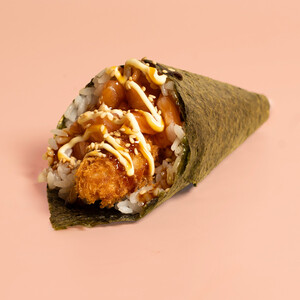 Riso, alga nori, salmone, gambero in tempura, maionese, teriyaki.